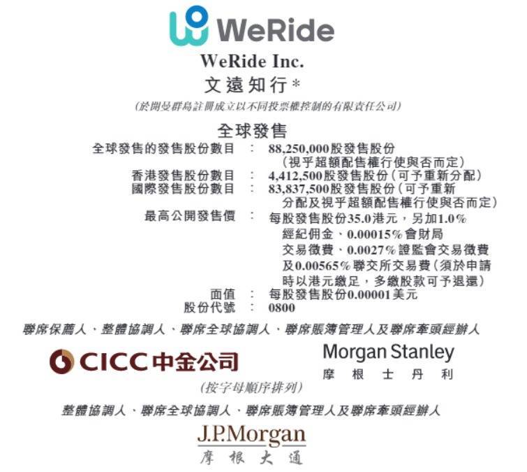 【大河财立方消息】10月28日,文远知行港交所公告,公司拟全球发售8825万股发售股份,中国香港发售股份441.25万股,国际发售股份8383.75万股(以上可予重新分配及视乎超额配售权行使与否而定);2025年10月28日至11月3日招股,预期定价日为11月4日;公开发售价将不会高于每股发售股份35.0港元,每手买卖单位为100股,中金公司及摩根士丹利为联席保荐人;预期A类普通股将于2025年11月6日开始在联交所买卖。